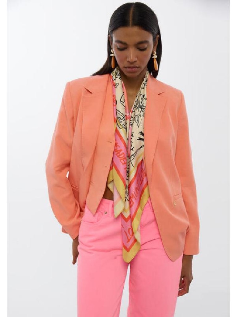 AMERICANA DESESTRUCTURADA REGULAR EN VIBRANTE TONO CORAL SIN BOTONES CON SOLAPA CLASICA Y BOLSILLOS CON ABERTURA OJAL