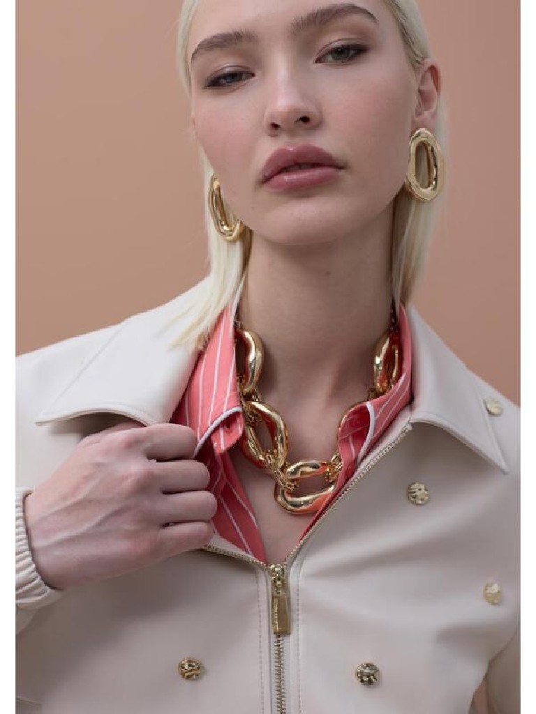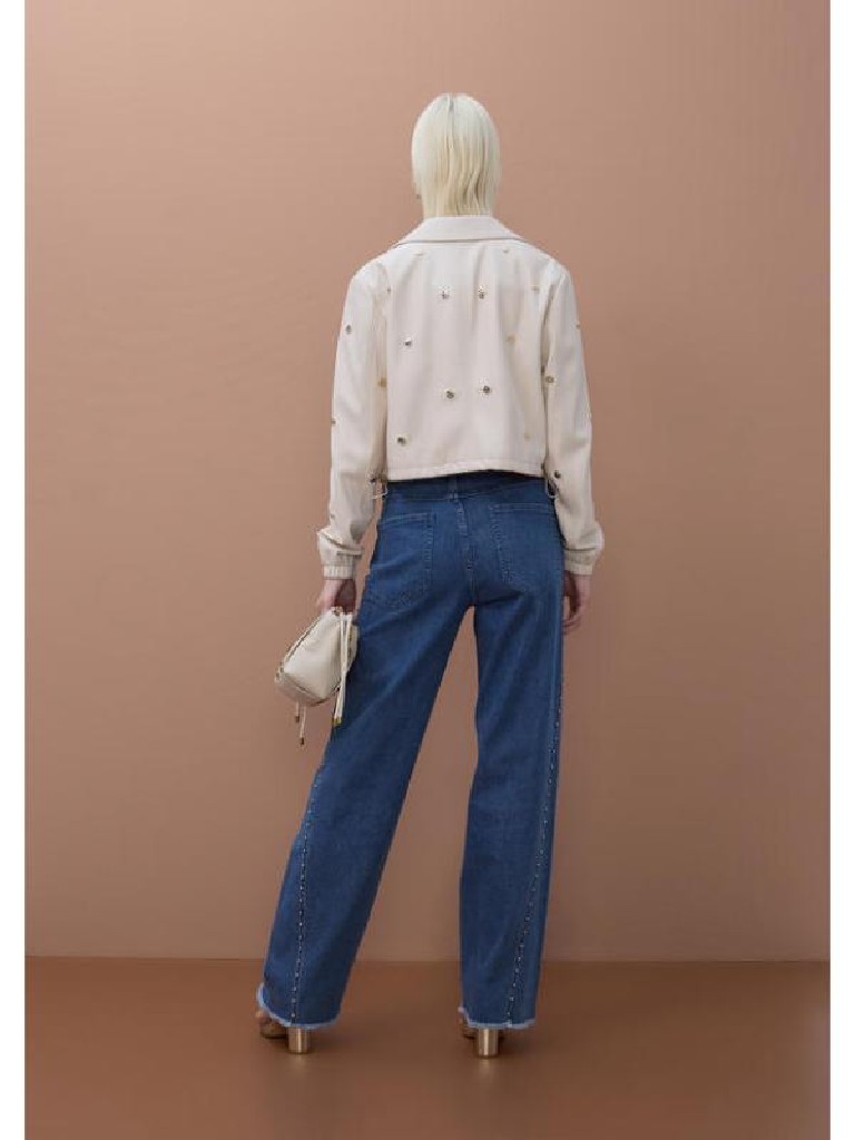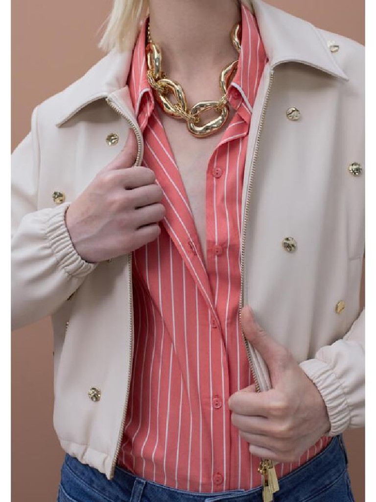 CHAQUETA TIPO BOMBER CON CUELLO CAMISERO Y BAJO AJUSTABLE REGULABLE BOLSILLOS OJAL CON CIERRE CREMALLERA CON DOBLE CARRIL PUÑO CON GOMA CUENTA CON APLIQUES EN DORADOS