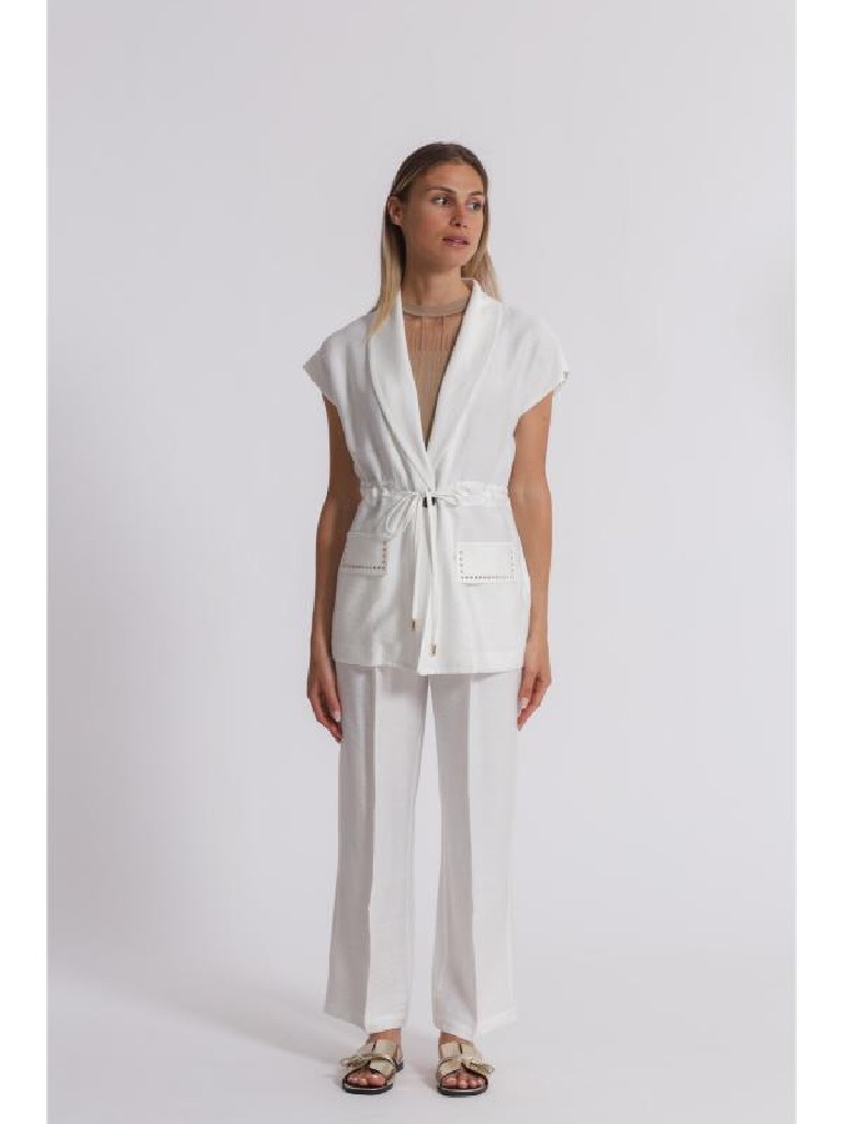 BLUSA CUELLO CAMISERO CIERRE BOTONES DELANTEROS CON BOLSILLOS DE PLASTON CON TAPETA EN EL PECHO MANGA CAIDA CORTA CON VUELTA EFECTO CHAQUETA