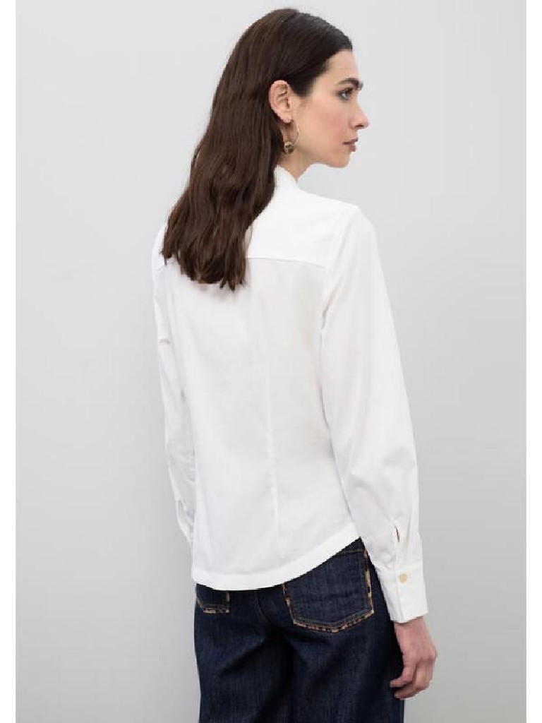 CAMISA ENTALLADA CON CUELLO CAMISERO ABOTONADURA DELANTERA OCULTA CON CORTE HOMBRO Y TACHUELAS DORADAS PLANAS CON LOGO LC GRABADO BOTON CUELLO Y PUÑOS EN DORADO