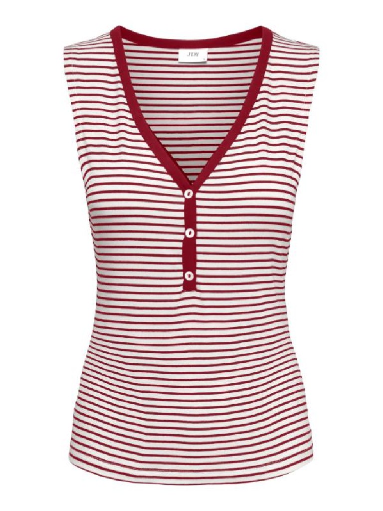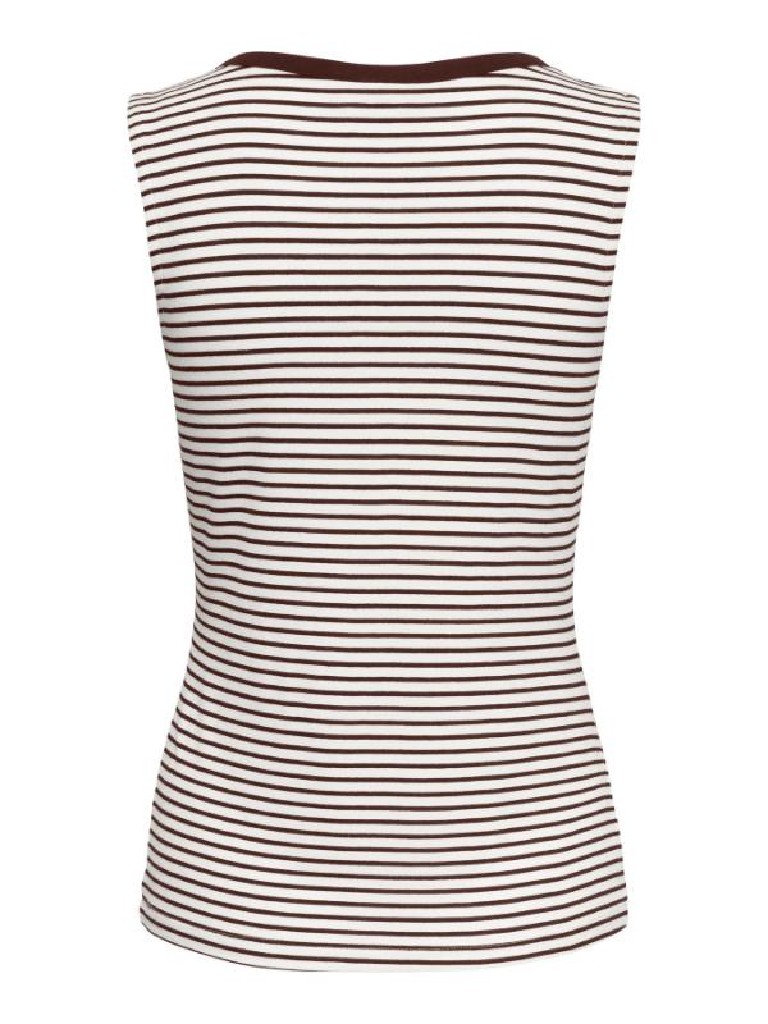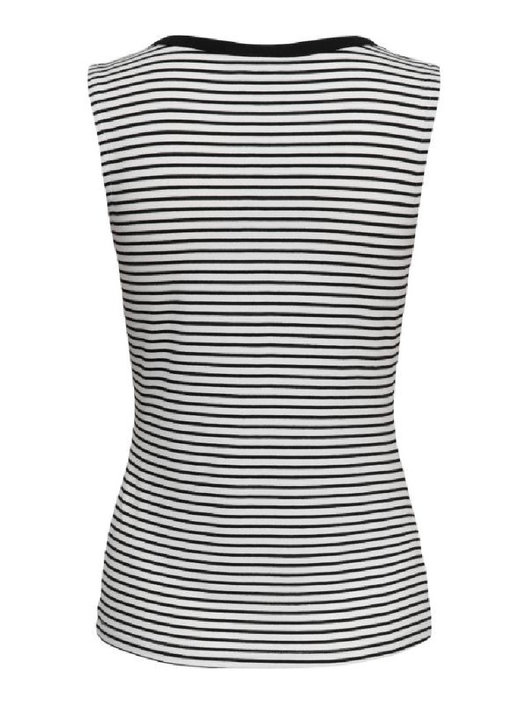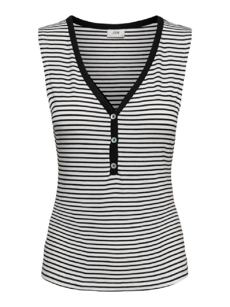 CAMISETA SIN MANGAS CUELLO PICO CON 3 BOTONES PARA REGULAR LA AVERTURA DE ESCOTE VIVO EN EL ESCOTE AL TONO DE LAS RAYAS