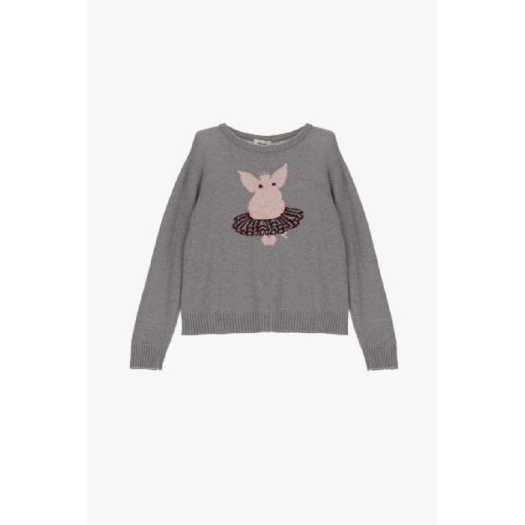 JERSEY DE PUNTO CON DIBUJO EN LA PARTA DELANTERA DE UN «CERDITO/BAILARINA», CUELLO REDONDO Y FENEFA EN PUÑOS Y LARGO. COMPOSICION 30%LANA, 33%POLIAMIDA, 5%CASHMIRE, 2% POLIESTER. DIXIE