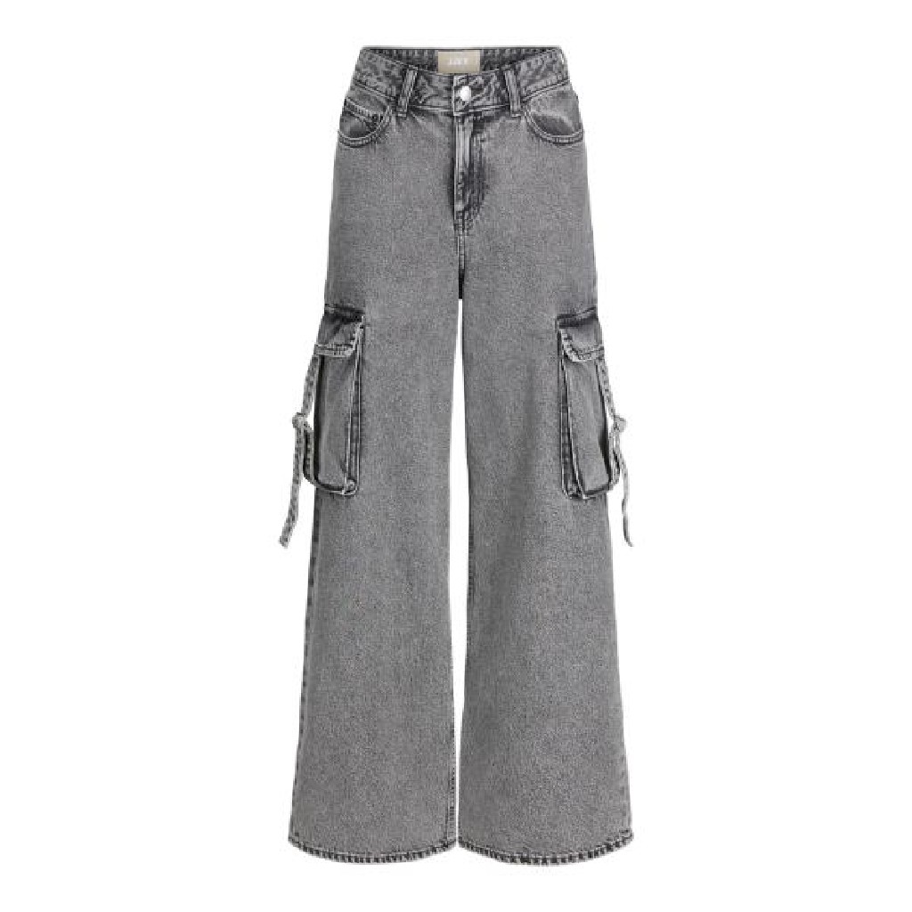 PANTALON CARGO CON GRANDES BOLSILLOS EN LOS LATERALES DE LA PIERNA Y CON DETALLES UNAS TIRAS CON ARANDELA PARA AGUSTAR EL BOLSILLO. BOLSILLOS TRASEROS. CREMALLERA Y BOTON. PERNERA ANCHA. EN TONO DESGASTADO. JJXX.